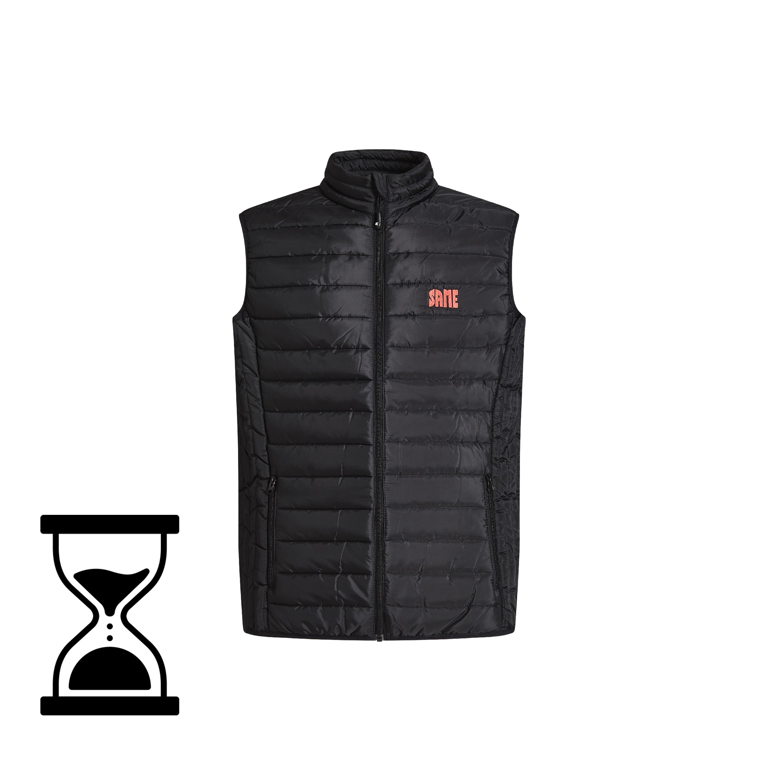 El chaleco negro SAME para hombre, con el logotipo rojo bordado en el pecho, está confeccionado con un tejido impermeable y resistente a la intemperie. Su acolchado de alta calidad lo hace suave y cómodo de llevar. Detalles como los dos bolsillos con cremallera, las costuras verticales a lo largo de los costados, el tejido que protege la barbilla y el acabado elástico tanto en las sisas como en el dobladillo permiten un ajuste óptimo y hacen que esta prenda sea perfecta para quienes buscan un atuendo versátil y funcional.