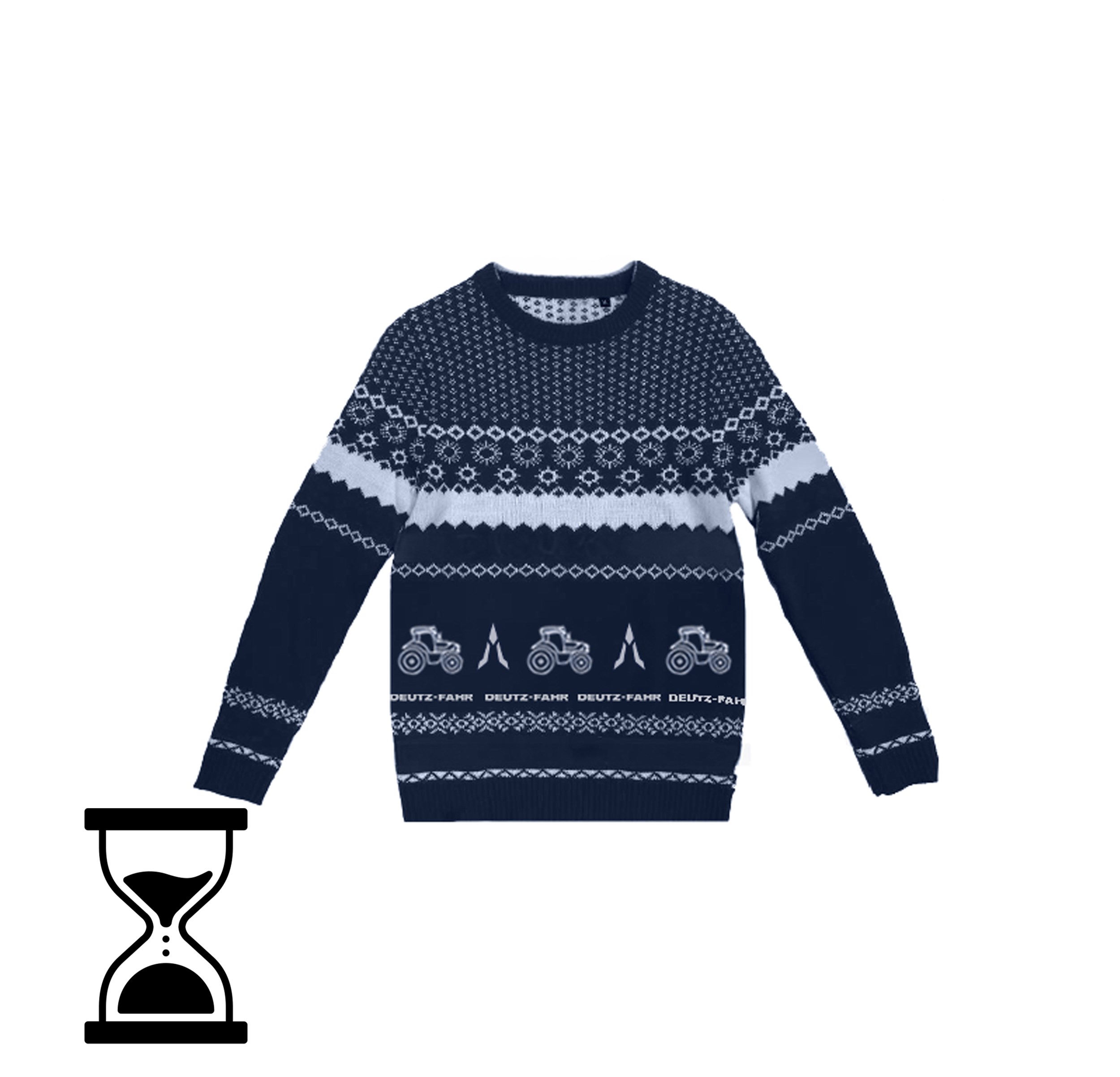 El jersey navideño de cuello redondo DEUTZ-FAHR, tejido con una finura de 5 Gg, está confeccionado en un tejido mixto de acrílico y lana, que lo hace cálido y duradero. Una prenda imprescindible para todas las familias DEUTZ-FAHR.
