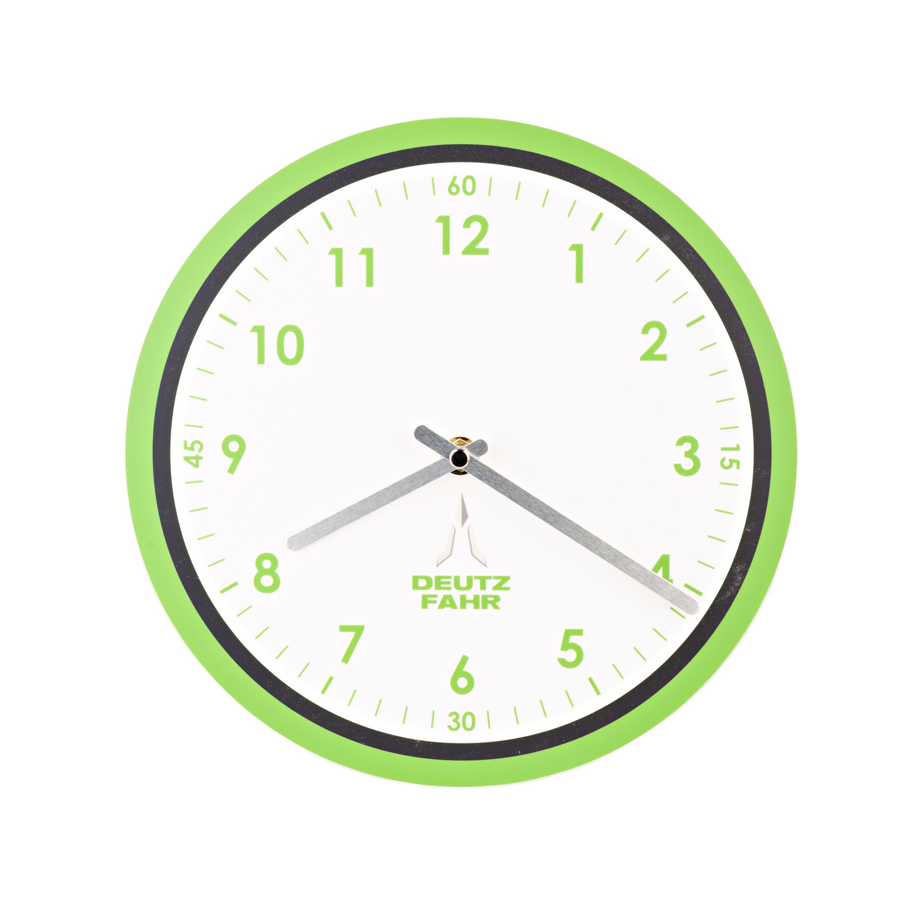 Reloj de pared redondo DEUTZ-FAHR con agujas negras. Personalizado con los colores característicos de la marca. Suministrado sin pila.